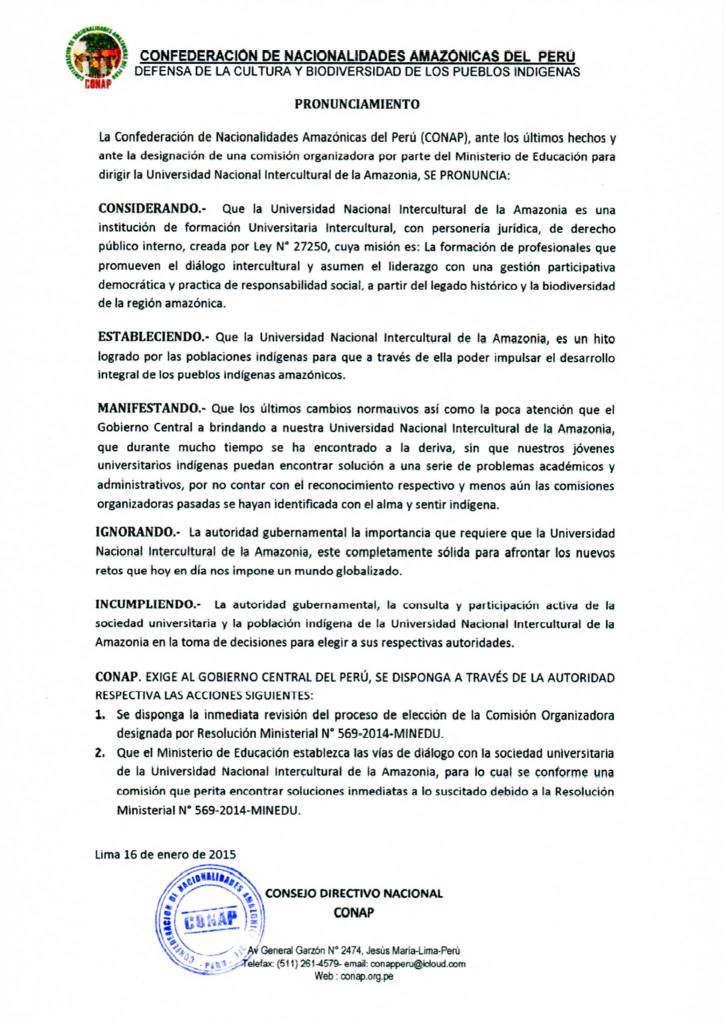 CONAP sobre la creación de una comisión por parte del Ministerio de Educación para dirigir a la Universidad Intercultural de la Amazonia 22 de septiembre de 2022 por Confederación de Nacionalidades Amazónicas del Perú, posted in PRONUNCIAMIENTOS 17 de Enero del 2015 Comparte esto: Haz clic para compartir en X (Se abre en una ventana nueva) X Haz clic para compartir en Facebook (Se abre en una ventana nueva) Facebook Me gusta Cargando... Relacionado