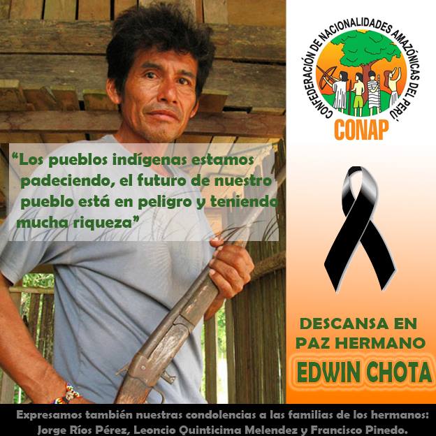 El 1 de setiembre fueron asesinados el jefe de la comunidad de Alto Tamaya-Saweto Edwin Chota Valera y los hermanos #asháninkasJorge Ríos Pérez, Leoncio Quinticima Melendez y Francisco Pinedo, la emboscada fue realizada por madereros informales cuando los hermanos se dirigían a una reunión en el río Amonya