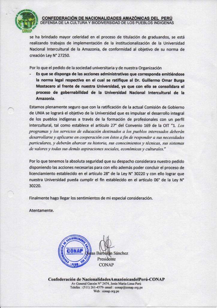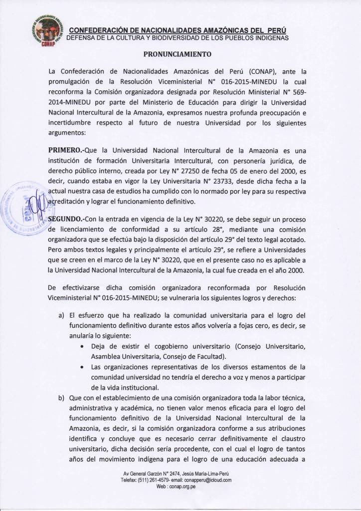 La Confederación de Nacionalidades Amazónicas el Perú – CONAP se pronuncia antes los sucesos ocurridos en la Universidad Nacional Intercultural de la Amazonía UNIA