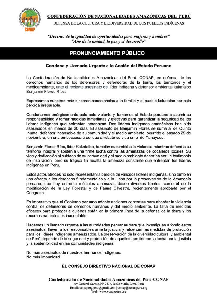 #PRONUNCIAMIENTO | Ante los asesinatos de nuestros hermanos y hermanas indígenas 12 de febrero de 2024 por Confederación de Nacionalidades Amazónicas del Perú, posted in PRONUNCIAMIENTOS 20 de Diciembre del 2023 Comparte esto: Haz clic para compartir en X (Se abre en una ventana nueva) X Haz clic para compartir en Facebook (Se abre en una ventana nueva) Facebook Me gusta Cargando... Relacionado