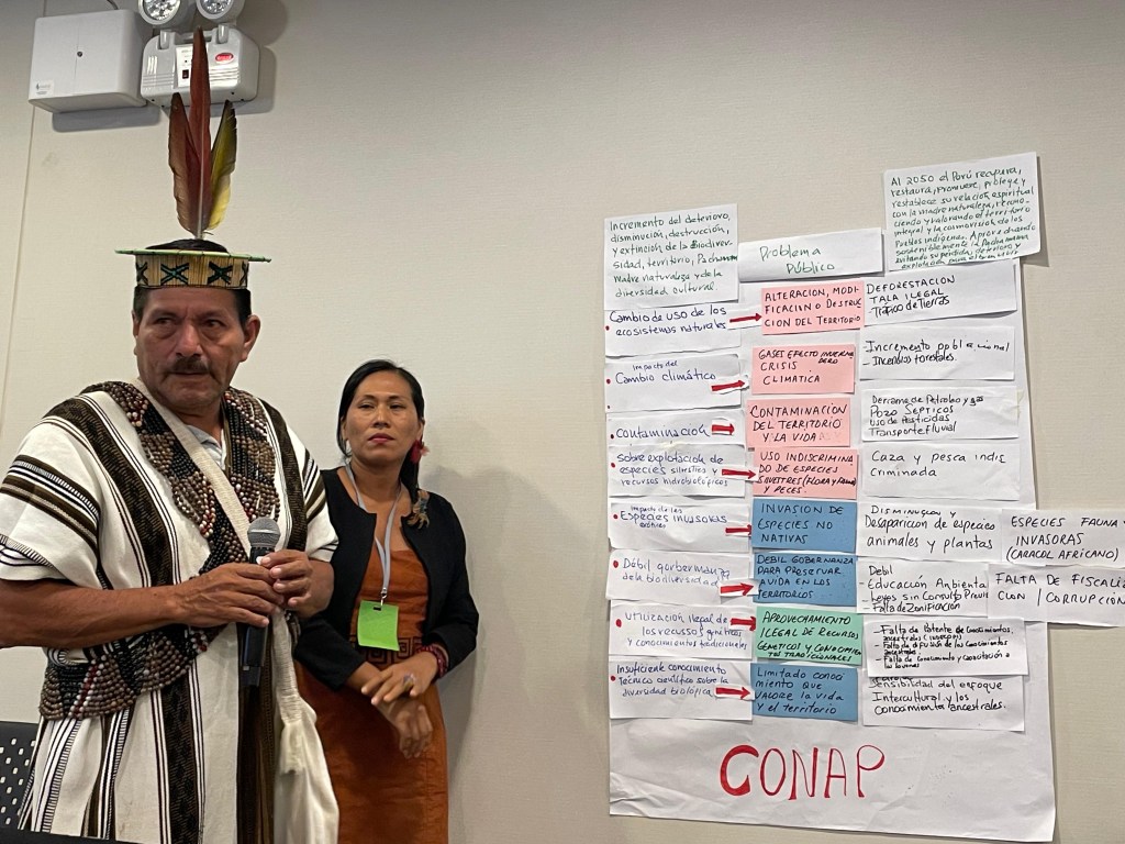 Durante el 25 y 26 de Abril, se ha continuado los talleres de proceso participativo para la Actualización de la Estrategia Nacional de Diversidad Biológica. A este taller asistió Denisse Iroba, Secretaria de Asuntos Femeninos de CONAP, junto a líderes de nuestras bases regionales y locales de FECONAYA, ORNASEC, CECONAMA y ORNAU.